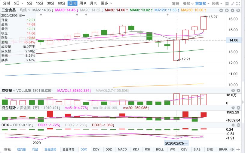 以三全食品为例,在发布公告的次日,2月3日股市开盘当天,大部分食品板块股价不同程度下跌,但三全食品股价大幅增长3.84%,并连续4天持续增长,其所处的速冻食品行业也成为了春节和疫情期间最受热捧的领域。