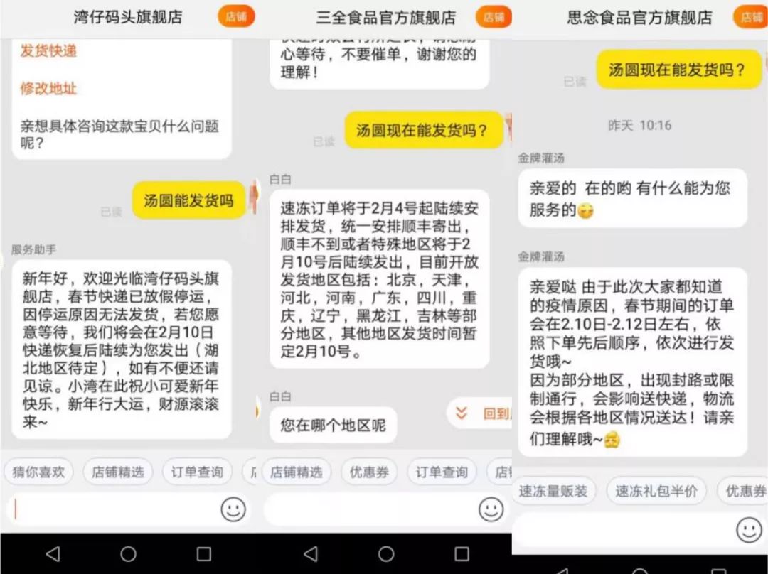 截至2月7日,「创业最前线」在电商平台咨询了三全食品、思念食品及湾仔码头品牌店铺,询问目前是否可以发货,得到的答案基本相同:由于疫情原因,春节期间的订单会在2月10日-2月12日之间依次进行发货,但涉及到疫情严重的地区可能会随时调整变动,各地区不能保证发货时效。