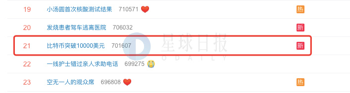 2月9日, “比特币突破10000美元”登上微博热搜榜,曾排名21位。