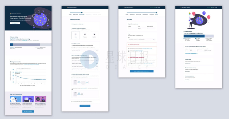 ETH 2.0抵押合约接口泄漏。ETH 2.0的抵押过程已经泄漏了,其屏幕截图逐步显示了如何将32 ETH从工作量证明(PoW)链发送到新的权益证明(PoS)信标链。该过程首先对质押和奖励进行快速描述,然后生成用于验证的密钥对。冷热钱包设置中将有两个用于验证程序的密钥。一个密钥是仅用于验证质押者身份,这是热钱包密钥。另一个密钥控制ETH的移动,这是冷钱包密钥或现在的私钥。以上内容是由设计师团队Deep work Studio透露的。它是一个旧版本,实际上,您可以看出奖励比以太坊联合创始人Vitalik Buterin目前的估计低一些。以太坊基金会的以太坊2.0研究员Carl Beekhuizen曾在提到这些幻灯片时表示,“这是一个早期的原型,还有很多工作要做。”以太坊2.0协调员Danny Ryan称,Beekhuizen正在领导存款合约的用户界面方面,这项工作正在进行中。“我们正在与那个设计团队签约,并将其投入生产。我想那是一个预告片。”