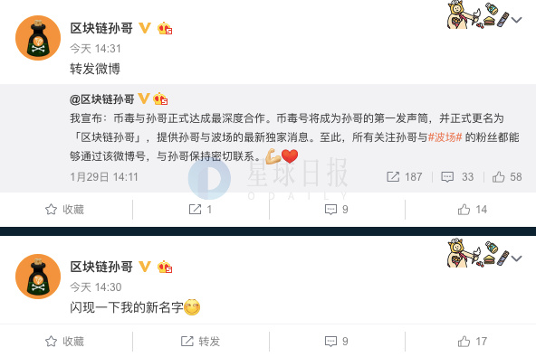 原微博账号“币毒”现已更名为“区块链孙哥”。该账号在1月29日发布的一条动态中称:“币毒与孙哥正式达成最深度合作。币毒号将成为孙哥的第一发声筒,并正式更名为「区块链孙哥」,提供孙哥与波场的最新独家消息。至此,所有关注孙哥与#波场#的粉丝都能够通过该微博号,与孙哥保持密切联系。”此外,在该条动态的下方,波场官方微博“波场TRON区块链”亦进行了互动回复:“锁定「区块链孙哥」,更多波场TRON一手资讯获取地”。