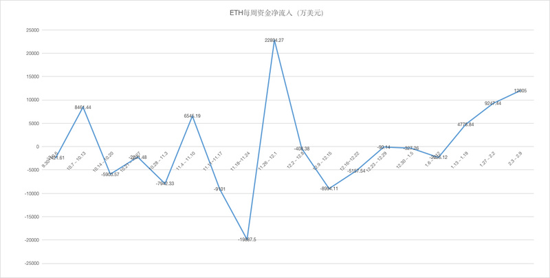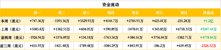 资金方面,上周资金波动较大,周三净流入资金最多,超过 5500 万美元;周二净流出资金最多,超过 1500 万美元。