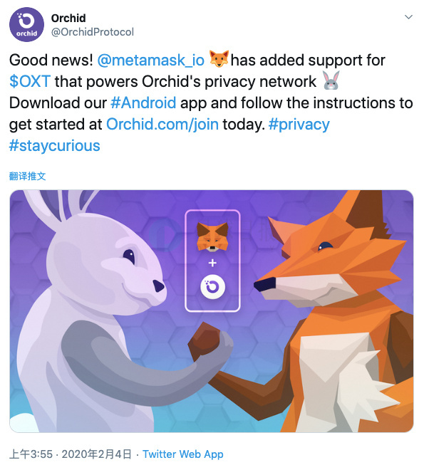 2月4日,分布式私有代理网络项目Orchid Protocol(兰花协议)发布推特称,以太坊轻钱包MetaMask增加了对其OXT代币的支持。(Twitter)