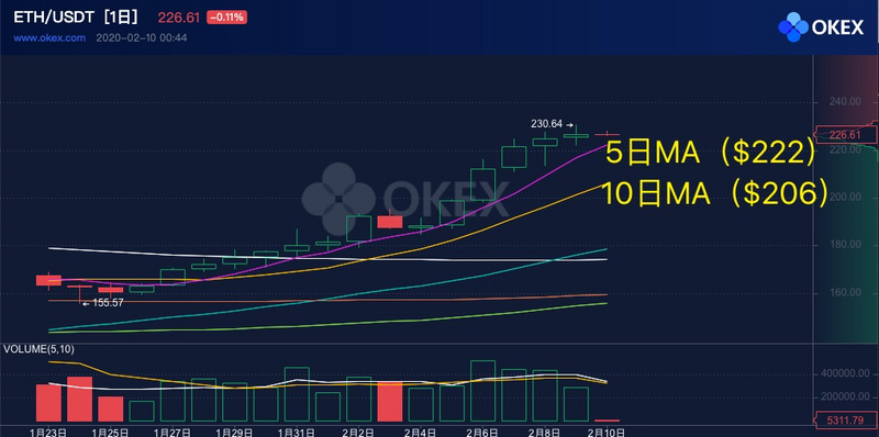 ETH 日线图上显示,目前价格站上 5 日均线,目前价格看涨,下一个阻力点在 240 美元附近,支撑位为 10 日均线(206美元)以及 5 日均线(222美元)。