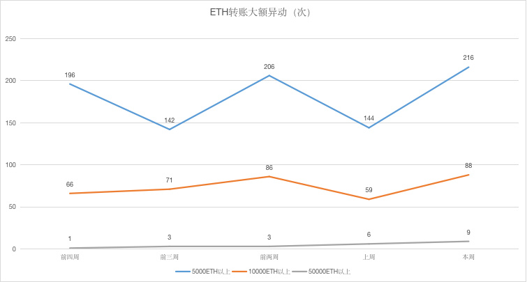 上周,“5 万 ETH 以上”转账次数共计 9 笔,最大转账金额 22.15 万个 ETH,转入与转入地址未知;有 4 笔转账是 Bitfinex 钱包地址互转,总量为 24.3 万个 ETH;其余转账地址均未知。