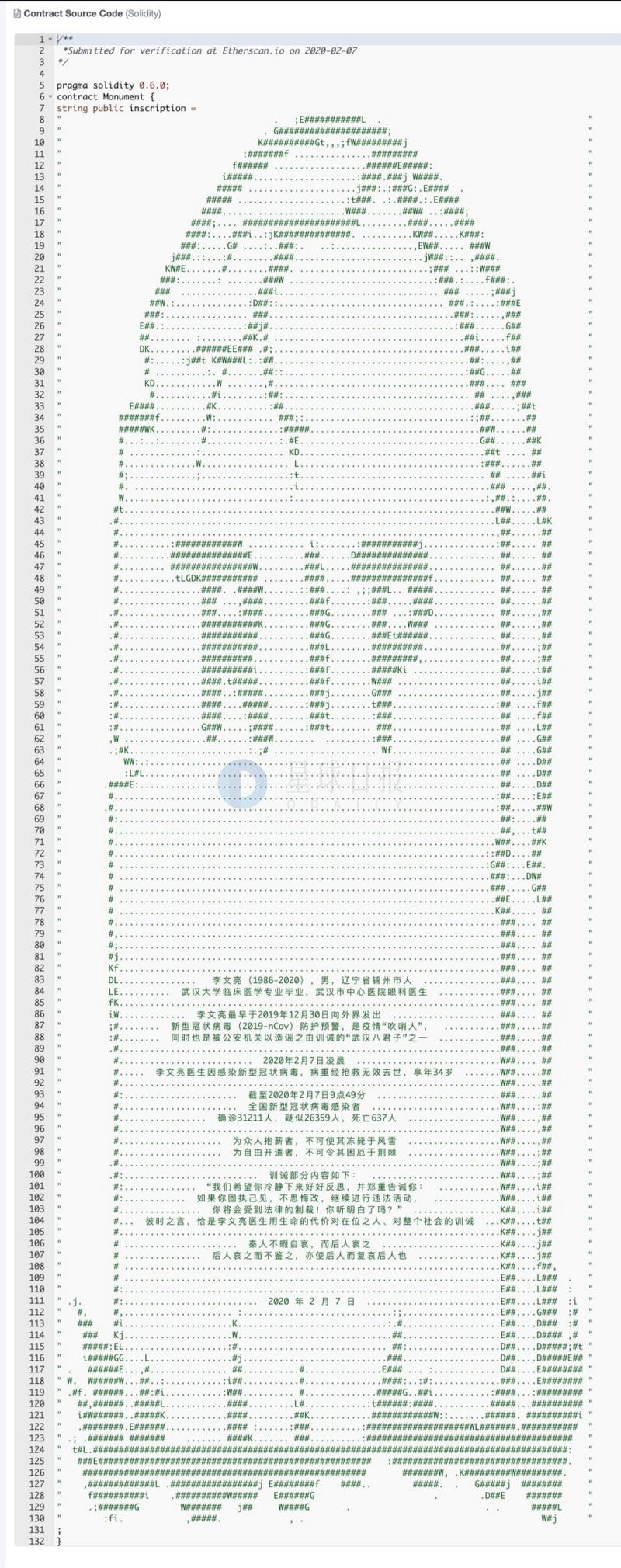 为纪念李文亮医生,社区用户已在以太坊区块链上为其树下一座墓碑,区块高度9432824。李文亮医生的事迹将永远铭刻在区块链上,不可篡改,不可删除。(etherscan)