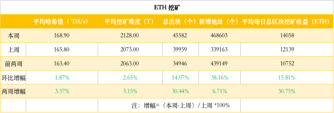 etherchain.org 数据显示,平均算力环比上涨 1.87%,暂报 168.9TH/s;上周矿工活跃度显著上涨,新增地址环比上涨 38%;出块量环比上涨 14%,平均每日挖矿收益上涨 15%,暂报 14058 个 ETH。