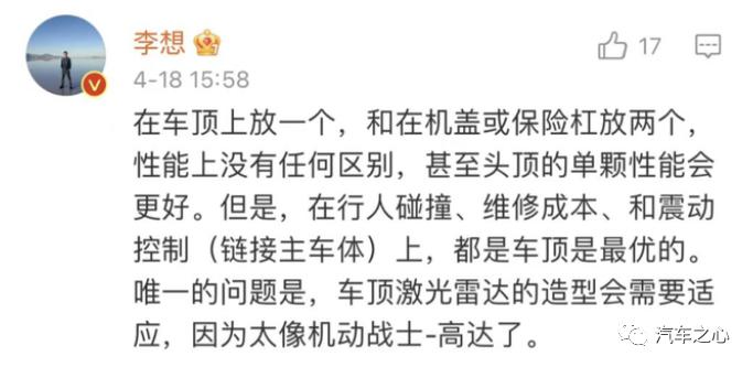 理想汽车 CEO 李想: 在车顶上放一个,和在机盖或保险杠放两个,性能上没有任何区别,甚至头顶的单颗性能会更好。但是,在行人碰撞、维修成本、和震动控制 (链接主车体) 上,都是车顶是最优的。唯一的问题是,车顶激光雷达的造型会需要适应,因为太像机动战士-高达了。