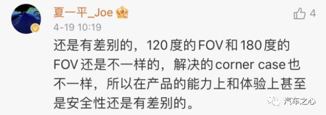集度汽车 CEO 夏一平: 还是有差别的,120 度的 FOV 和 180 度的 FOV 还是不一样的,解决的 conrner case 也不一样,所以在产品的能力上和体验上甚至是安全性还是有差别的。