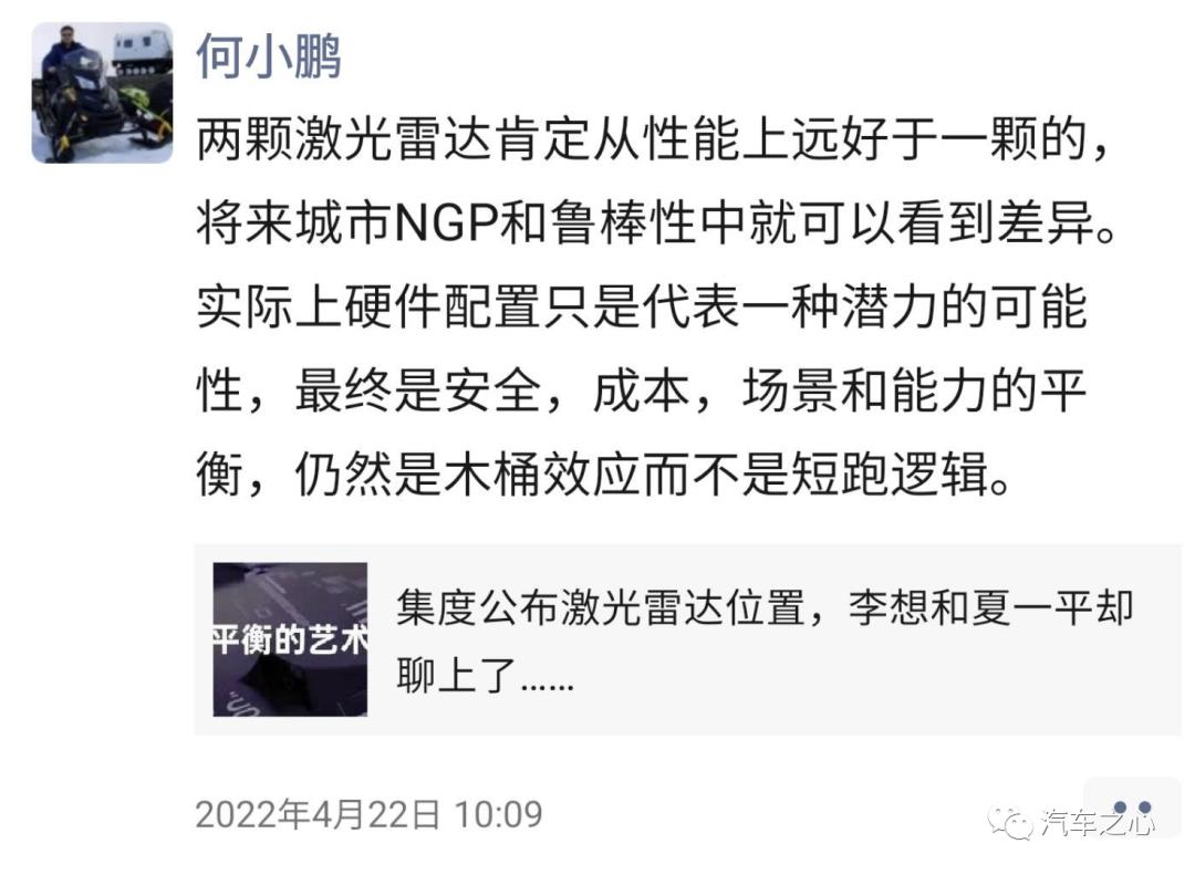 小鹏汽车 CEO 何小鹏: 两颗激光雷达肯定从性能上远好于一颗的,将来 城市 NGP 和 鲁棒性 中的就可以看到差异。实际上硬件配置只是代表一种潜力的可能性,最终是安全,成本,场景和能力的平衡,仍然是木桶效应而不是短跑逻辑。