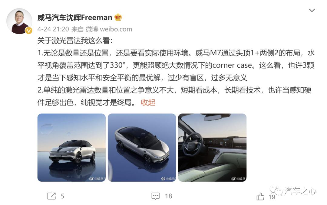 威马汽车 CEO 沈晖: 无论数量还是位置,还是要看实际使用环境,威马 M7 通过头顶 1+两侧 2 的布局,水平视角覆盖范围达到了 330° ,更能照顾绝大数情况下的 corner case。这么看,也许 3 颗 才是当下感知水平和安全平衡的最优解,过少有盲区,过多无意义。