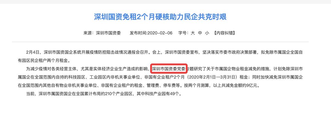 事实上,在2月4日召开的深圳市国资国企系统开展疫情防控阻击战情况通报会上,深圳市国资委就宣布,坚持落实市政府决策部署,计划免除深圳市属国企在全国范围内自持的科技园区、工业园区内非机关事业单位、非国有企业租户2个月租金,减免期为2020年2月1日~3月31日。按两个月测算,以上共减免金额约9亿元。