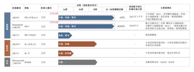 康方生物科技在聆讯资料集中表示,AK104是公司的新型的、潜在首创的PD-1/CTLA-4双特异性抗体。这是一种可同时靶向PD-1和CTLA-4的双抗候选药,目前正在中国和澳洲进行多种适应症的Ib/II期及II期临床试验,并正在美国启动一项临床试验。