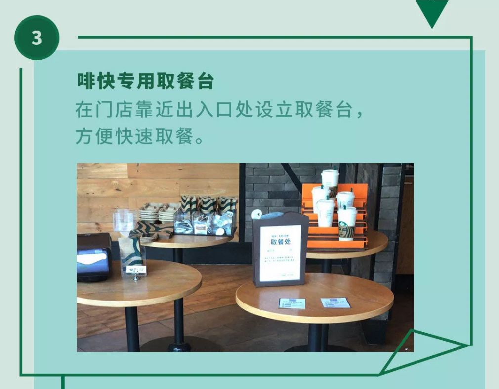 而现在,星巴克特地在门店靠近出入口处设立了取餐台,用户可以快速取餐,减少与人接触的机会。