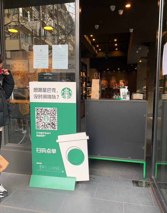 甚至,有些门店直接把取餐口安排在门口处,用户直接在门口的小桌上扫码下单、取走咖啡。这操作,不管对店员还是对用户,其实都是比较保险的。