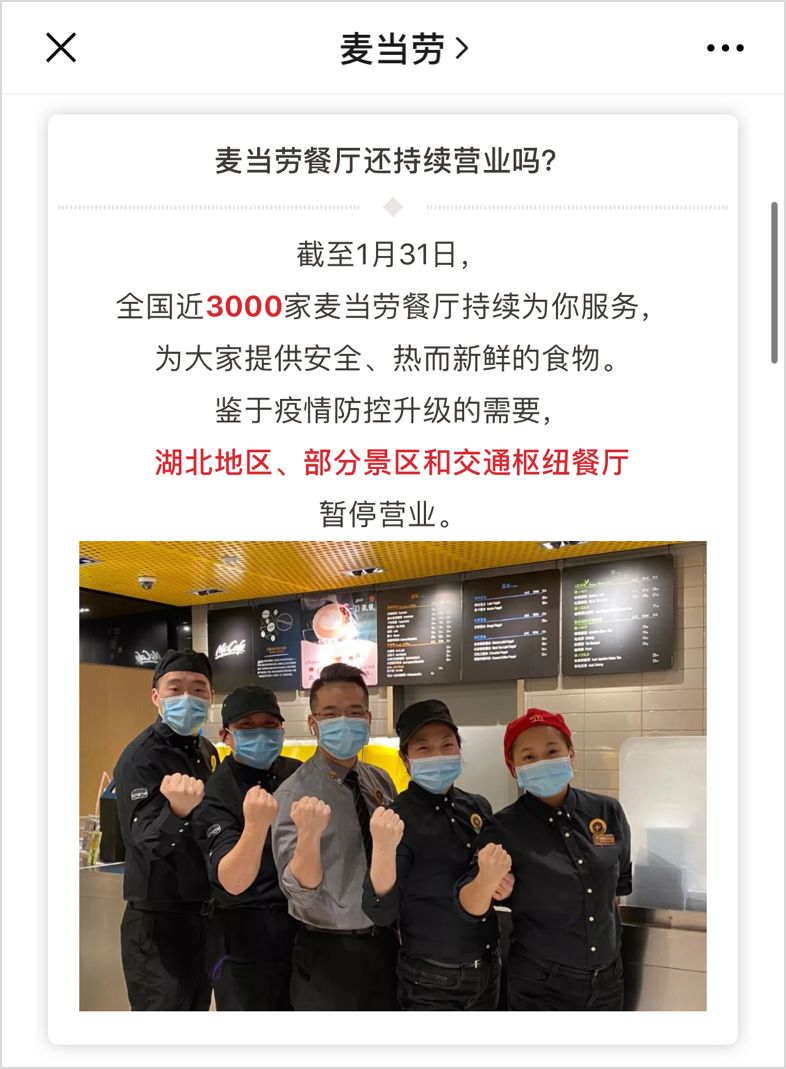 比如麦当劳,截至 1 月 31 日,除了湖北地区、部分景区和交通枢纽餐厅,有近 3000 家餐厅在正常提供服务。