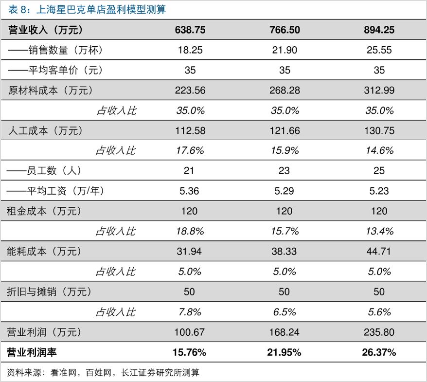 根据长江证券研究所测算的上海星巴克单店盈利模型。