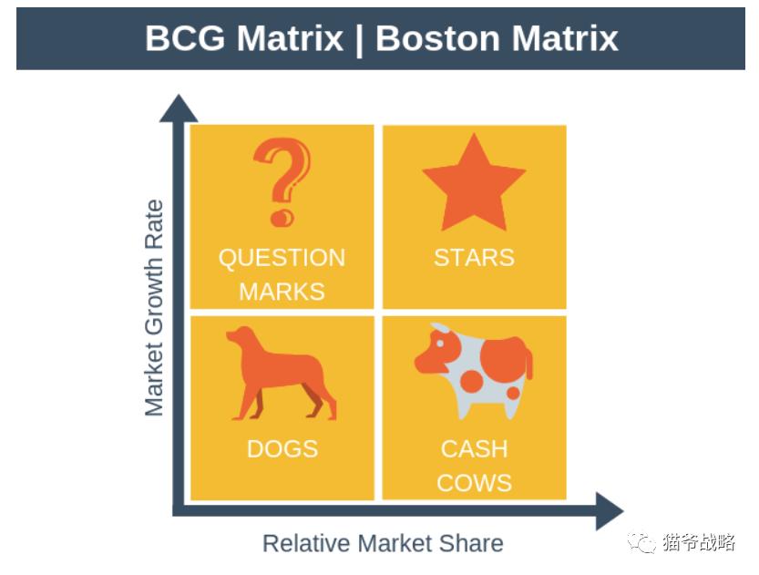 除了个人管理,还可以用来做市场分析。其中,最著名的莫过于波士顿管理咨询的产品矩阵模型了(BCG matrix):
