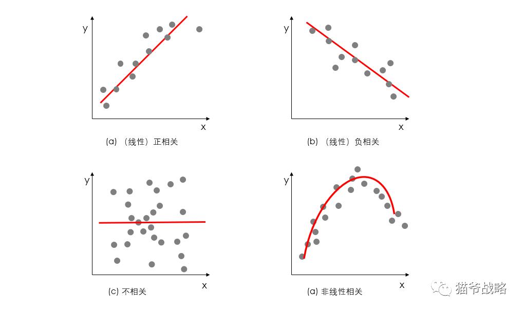 (d)非线性相关:某一范围内,X数量越多,Y数量越多;超过某一个拐点后,X数量越多,Y数量越少。