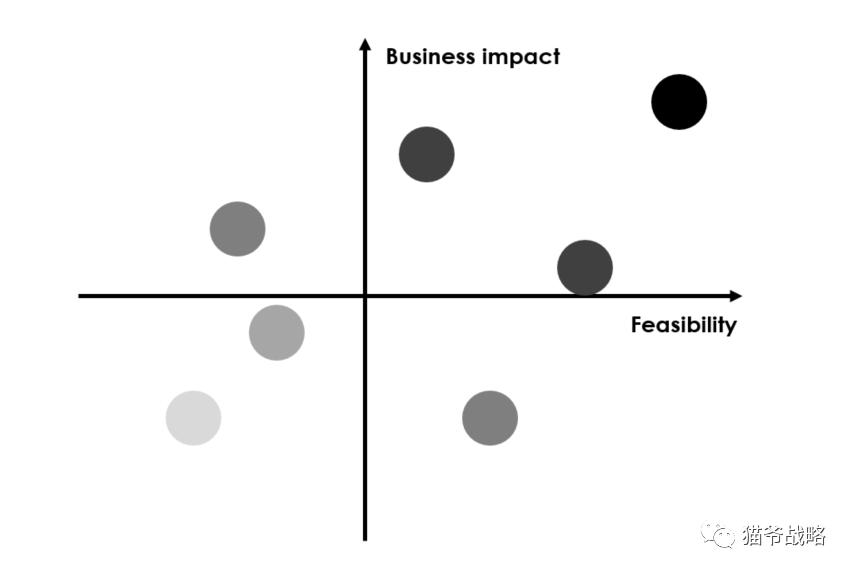 显而易见,你的重点就应该放在第一象限的项目中,尤其是颜色最深的右上方的那个项目,因为它的可行性最高,同时商业价值最大。