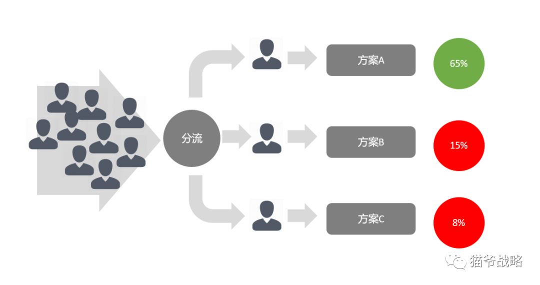 众多手机用户会被分配到不同的待定方案中,然后通过用户行为或者用户反馈来检验哪个方案是最成功或最受欢迎的。