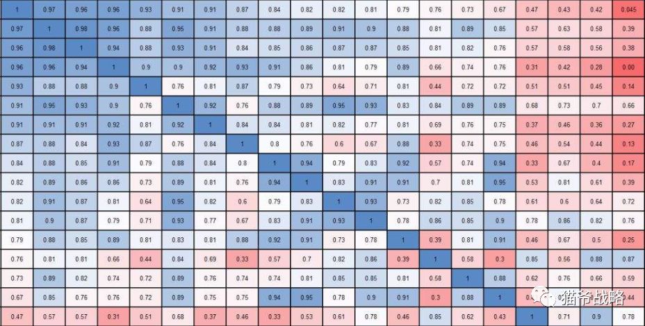 假设将横坐标的看作是产品销量(口红、粉底液、气垫、防晒霜等等),纵坐标看成是媒体投放渠道金额(微信、微博、爱奇艺、杂志等等)。那么,它们的两两之间的相关系数就会形成一张系数表。