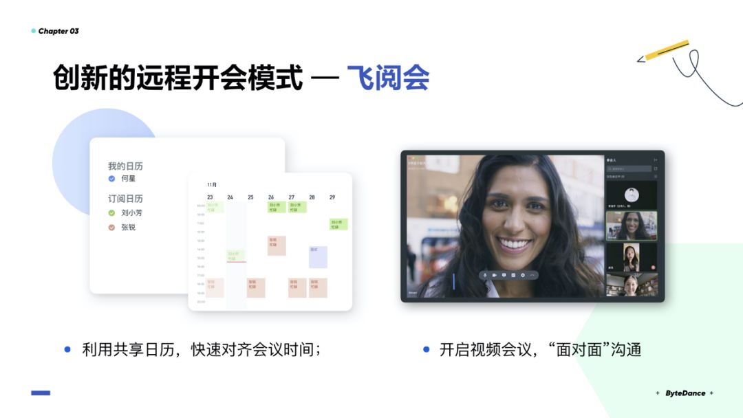 我们也开发了“日历”产品。它的功能比较强大,可以方便查找其他人的空闲时间,以及这个时间段能够使用的会议室。针对一个特定日历,我们可以快速创建群聊,大家进入一个群。当然也包括音视频会议,这是现在这个时间点,非常刚需的一个功能。