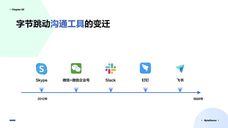 字节跳动更换过多款沟通工具。因为,我们认为,沟通对于信息的创造、分发、流转和消费,至关重要,甚至是公司最重要的一个通用工具。2012年字节跳动成立以来,每个时刻都努力使用当时我们认为最先进、最好用、最适合我们的工具。