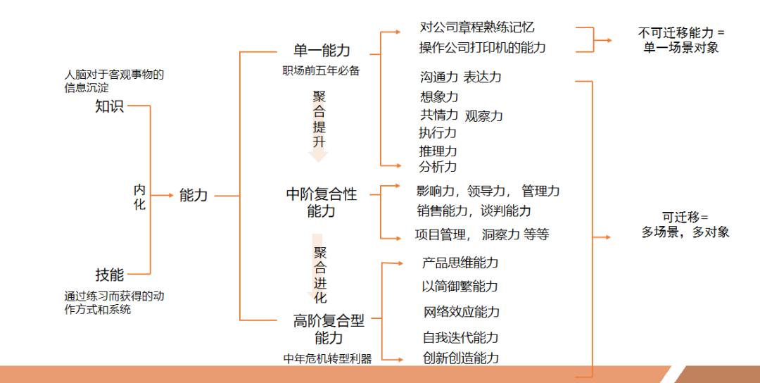 知识和技能构成能力,单一能力构成复合型能力,初阶能力内化后可以整合为中阶能力,同样的,中阶能力内化后可以整合为高阶能力。