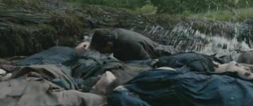 《1917》中,战争的残酷一览无余。无人区的死亡沼泽里遍布已经腐烂的尸体,落英缤纷的河流里同样人尸漂浮;原本世外桃源般的小镇被炸成了断壁残垣,火光将黎明前照耀得亮如白昼,恐怖气息蔓延;仍未断奶的婴儿只能被藏在五斗柜的抽屉里;对敌军怀有仁慈之心的士兵,转瞬却被反杀……