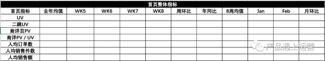 第一类是首页整体指标,在前述的首页核心指标体系中选择关注的一组指标,以周为单位进行统计,同时对周环比、年同比进行观察,如果出现大幅波动,则进行深入分析,找到原因。此外还可以观察月趋势,根据七点原则,对连续的同趋势变化进行分析。