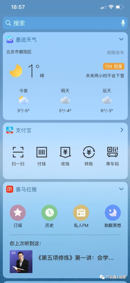 4)系统快捷功能入口:如iPhone等大部分手机支持的负一屏。从手机第一屏向右划,进入的第一屏左侧页面即为负一屏,在这里可以放置组件,指向应用内功能。此外还有在iPhone最新版本中已取消的3D touch,这是个iPhone 6S开始支持,但用户习惯最终没养成的功能。它通过大力按压app图标,展示出一组特定入口,点击后直达app特定页面。