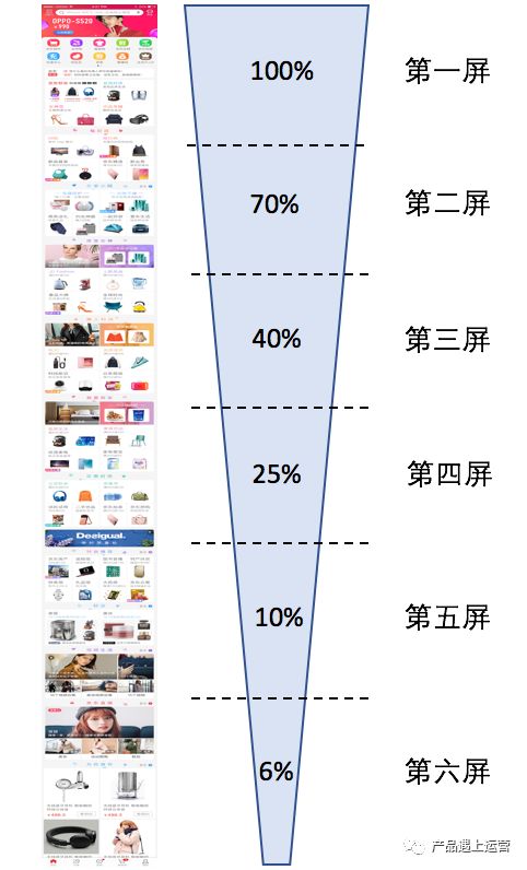 主流电商的“猜你喜欢”大约有5%~20%的流量。从首屏到底部,中间流量分布可做曝光埋点统计各栏目被展示的次数。根据经验,超过60%的流量仅到达首屏和二屏,随后有个断崖,三屏之后的流量视栏目情况递减速度不同。当然曝光和点击未必成正比。
