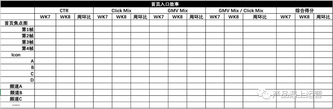 第二类是入口效率指标,评估首页各个资源位的表现。可以在前述首页管理指标体系中选取关注的一组指标,同样以周为单位进行统计,观察每个资源位效率的周环比和年同比(如果同一个频道占据同一个入口)波动情况和连续变化趋势,并进行分析。