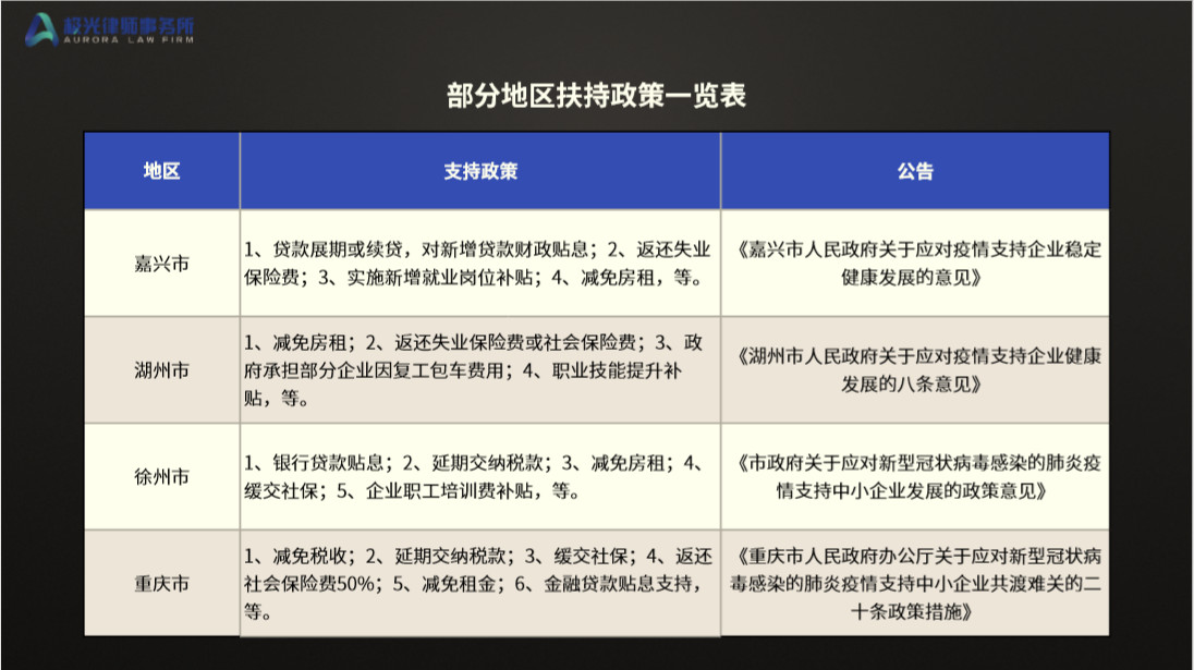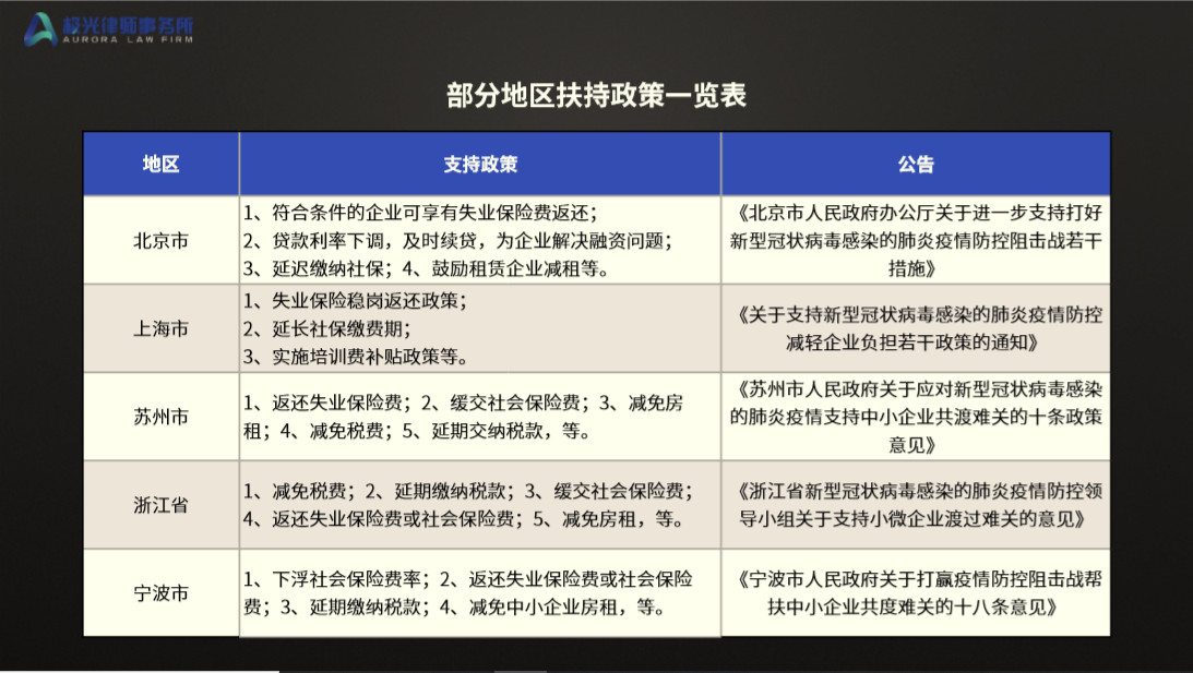 为减轻疫情对中小微企业生产经营的影响,帮扶企业共渡难关,各地纷纷出台各种扶持政策,包括稳岗补贴、培训费补贴、社保延迟缴纳、减免房租税费等。对于受疫情影响较大的企业,可把握政策窗口期,在实操不明确的前提下,主动联系相关部门积极咨询落实,力争减少成本压力。