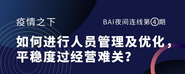 BAI夜间连线 vol.4/ 疫情之下,企业的人员管理及优化,于2月7日晚间9点准时上线,这是继vol.1/远程办公机制、vol.2/ 疫情阶段的融资策略与vol.3/ 实用财务风险应对手册后,BAI(贝塔斯曼亚洲投资基金)推出的第4期远程视频分享。