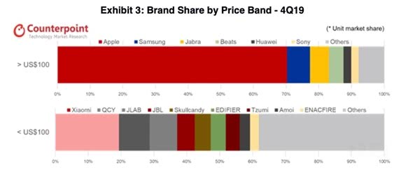 如果细分价格,100美元以上的真无线耳机中,苹果的销量份额超过70%,接下来是三星、Jabra、Beats、华为和索尼;100美元以下,小米表现抢眼,紧接着还有QCY、JLAB、Skullcandy、漫步者等。