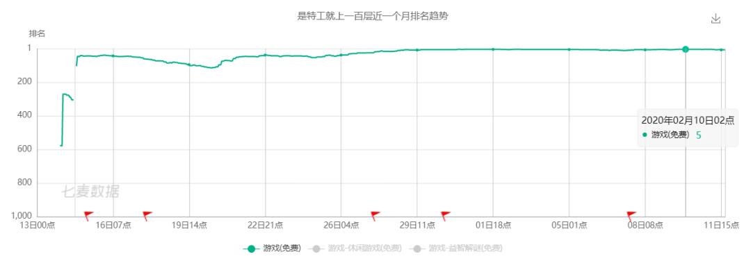 可以看到,随着投放力度的加大,产品在免费榜的走势也逐渐上升,如《是特工就上一百层》等产品,已经逐渐来到免费榜Top 5的行列。