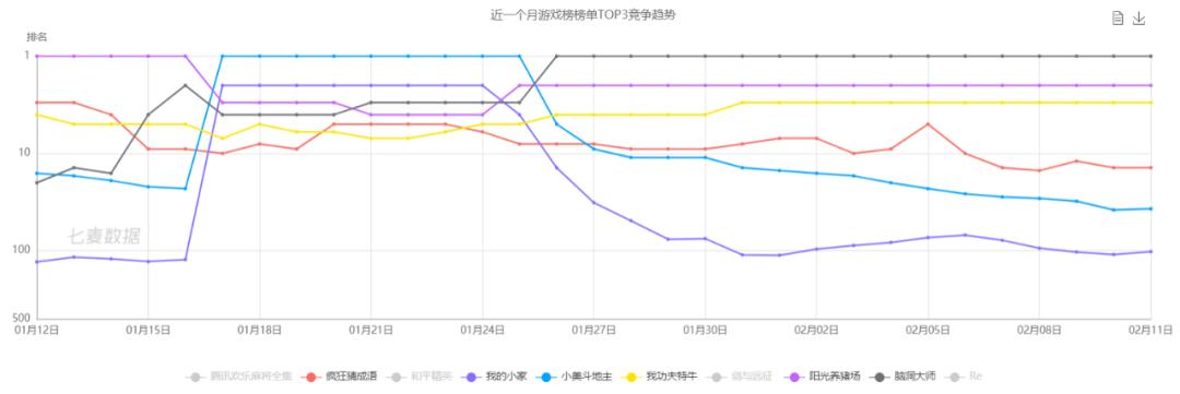用下面这张图,我们可以直观地看出休闲游戏在免费榜上的集中爆发态势。在1月15日到1月25日这10天内,《疯狂猜成语》《我的小家》《小美斗地主》《我功夫特牛》《阳光养猪场》《脑洞大师》这几款产品出现了集中汇聚免费榜前列的表现。而后几款产品成绩开始不同程度上扬和下滑,并进入相对平稳的时期。