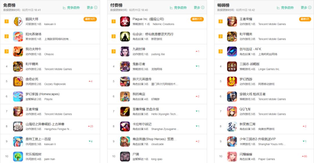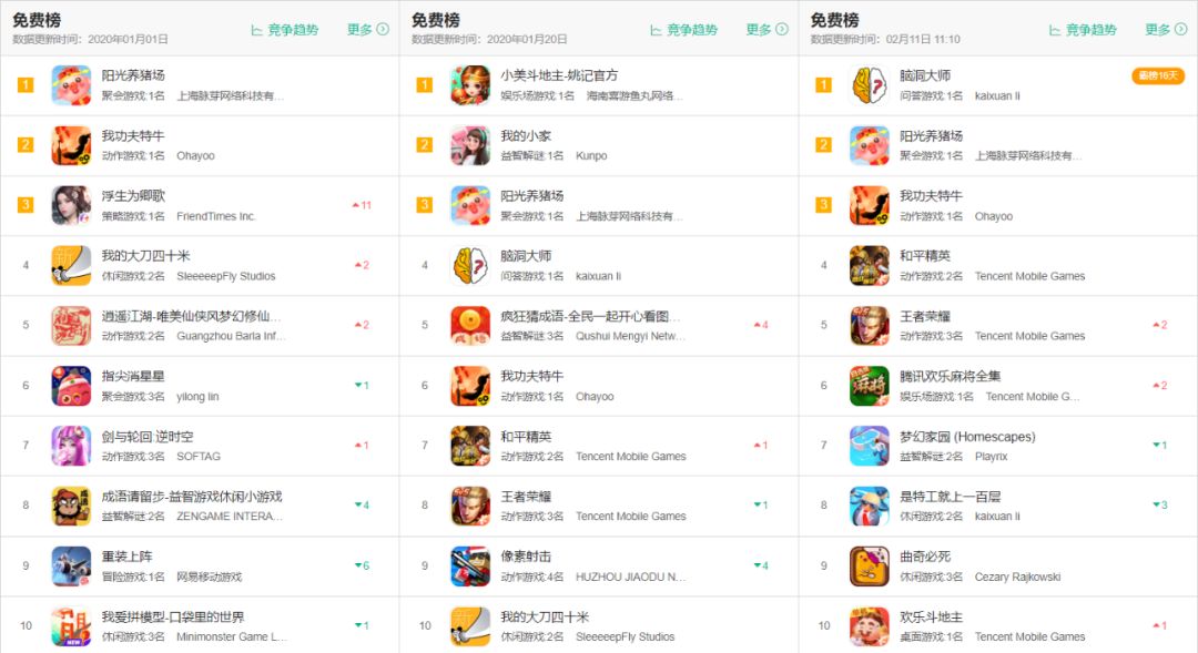 一方面,大量新品冲击免费榜,造成百家争鸣的局面。简单截取1月1日、1月20日、2月11日三个时间点的免费榜Top 10情况,可以发现换血率达到80%。除了《阳光养猪场》和《我功夫特牛》之外,免费榜上的面孔都换了一套。