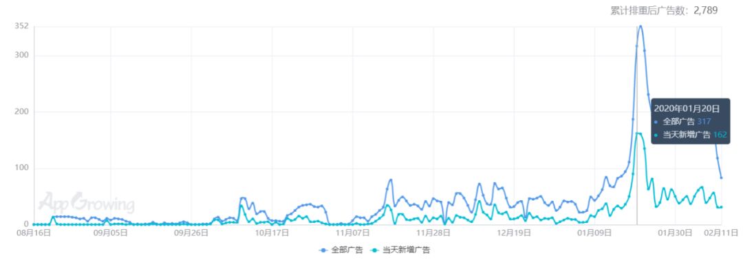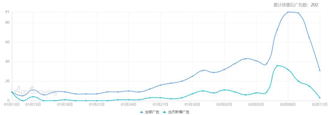 按照上线时间来划分,能看到这类产品大致可以三类:刚上线就爆量的新品、19年年中上线踩在春节节点做爆量的产品、上线已久在春节常规投放的老产品。