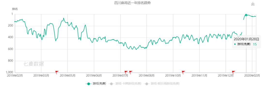 同时,棋牌类游戏还有少数仅依靠自然回流,不依靠广告投放而回归榜单前列的产品,这与春节档大多数产品都集中做投放的趋势相反。比如《四川麻将》和《微乐家乡麻将》等地方棋牌产品,在一段时间的沉寂之后,近些日子突然冲到免费榜Top 20之内。