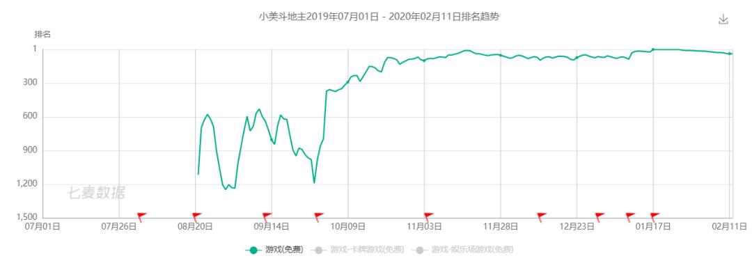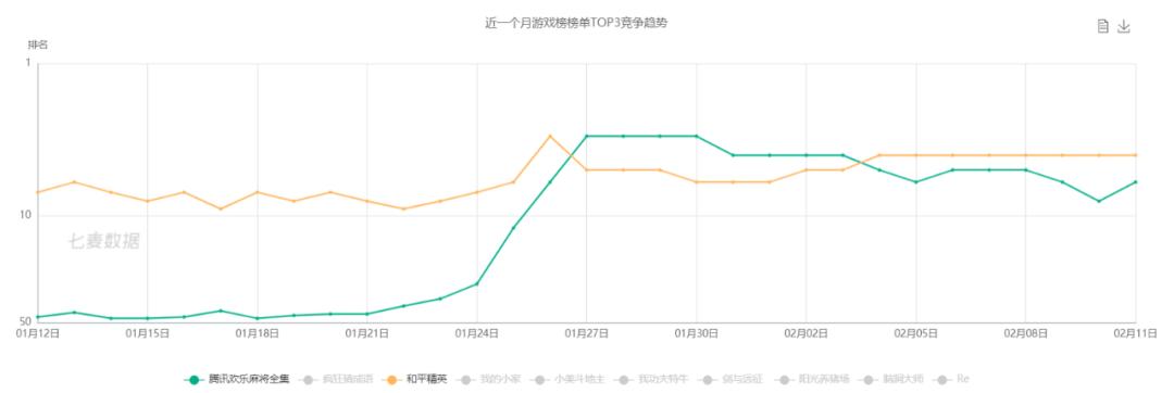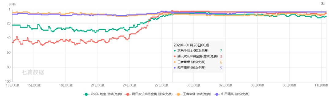 其中多数产品在疫情扩大之后,出现了明显的涨幅。以《腾讯欢乐麻将全集》为例,春节前夕该产品基本维持在免费榜50名前后,该状态一直延续到1月21日,而此后这款产品的免费榜排行一路来到Top 10以内,至今仍然维持在这一区间内。