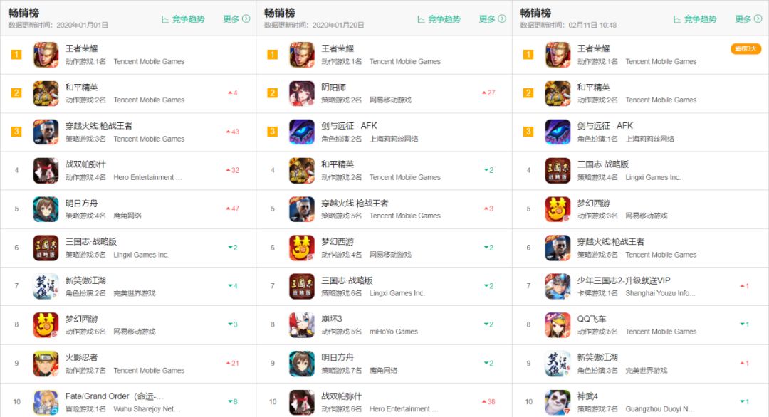 类似《碧蓝航线》从200之外冲到畅销11位,《崩坏3》《FGO》《战双帕弥什》等新老产品,都有不同程度的爆发。