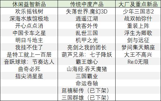 在31款新品中,休闲益智类新品有10款;传统品类中重度产品有13款,其中两款产品已被下架;而背靠大厂或重点资源的新品,仅有8款。可见相比之下,春节档上架的重点新品并不算多,而一些小体量的产品反而扎堆现象更明显。