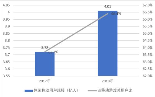 据伽马数据,从用户数量看,休闲手游玩家占比提升,2018年有4.01亿休闲手游玩家,占比66.4%。