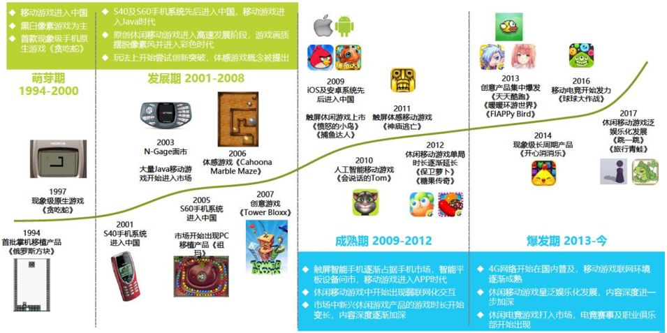 按照艾瑞咨询此前对休闲移动游戏发展历史的划分,大致可以分为四个阶段: