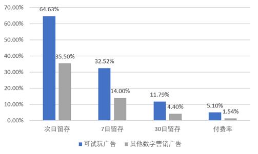 ▼可试玩广告的留存数据与付费率均高于其余广告形式