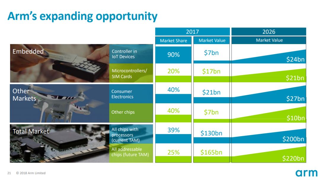 Arm在不同市场的份额和机会(source:Arm)