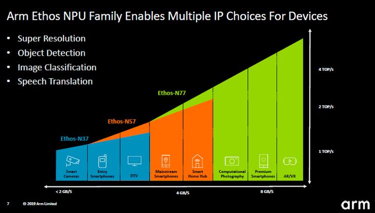 其实Arm NPU并不是什么新鲜事物。在文章开头我们已经说到,Arm在去年就推出了其Ethos N77/N57/N37系列NPU。如下图所示,Arm的这个家族的NPU是瞄准手机、AR/VR和智能监控等市场。